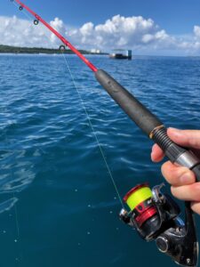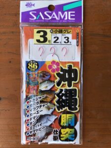 水面近くにはエサ取りの小さな熱帯魚がたくさん泳いでいる。水深は約18mとあまり深くはないが、「胴突き仕掛け」にオキアミを付け餌にして底まで落とす。
