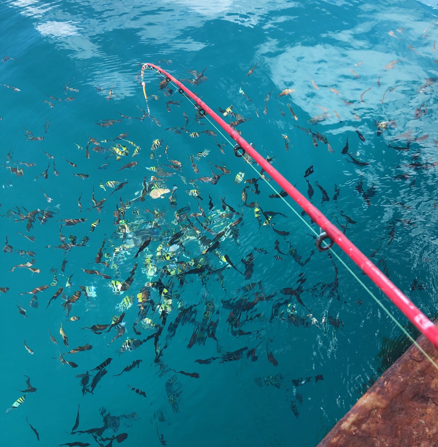 水面近くにはエサ取りの小さな熱帯魚がたくさん泳いでいる。水深は約18mとあまり深くはないが、「胴突き仕掛け」にオキアミを付け餌にして底まで落とす。