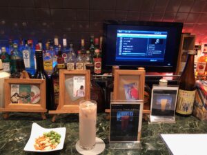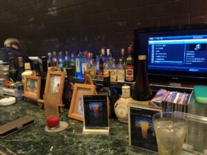 こちらはカウンターのほかにテーブル席も少しあって、20人ぐらいは入れそうだ。22時頃に行ったら常連さんの集団でほぼ満席状態のなか、壁際のテーブル席に一人で座った。メニューを見たが、曲名のついたオリジナルカクテルは見つけられなかったので、普通にハーパーのロックを注文した。